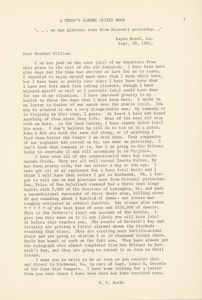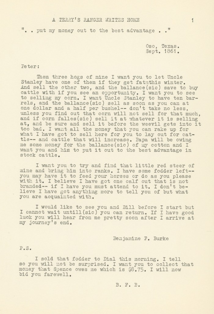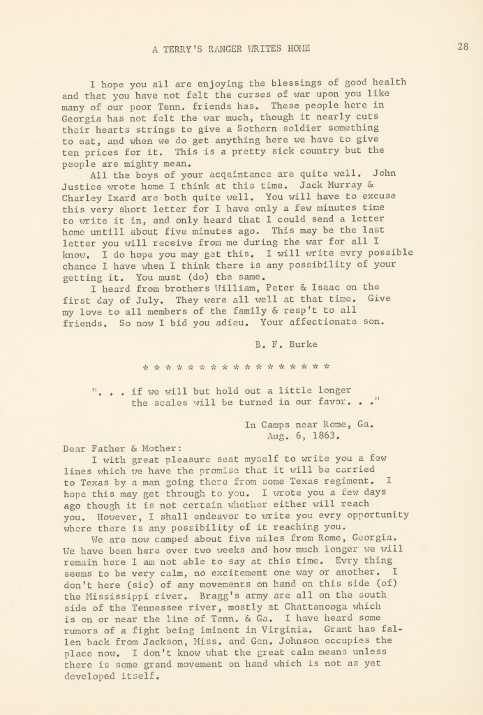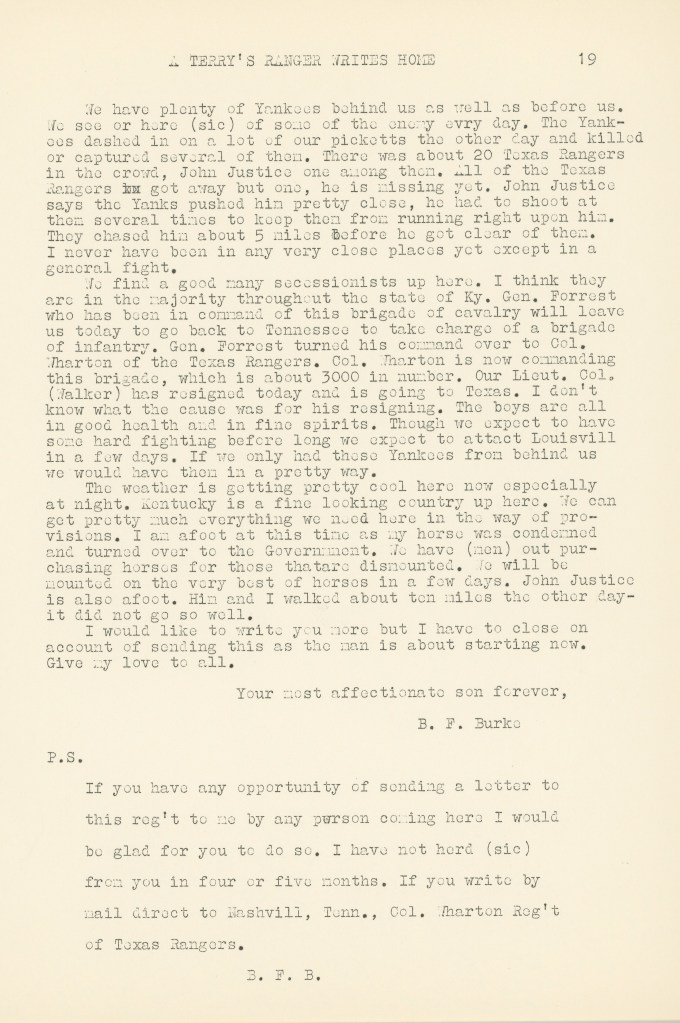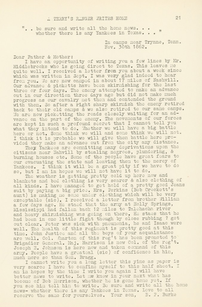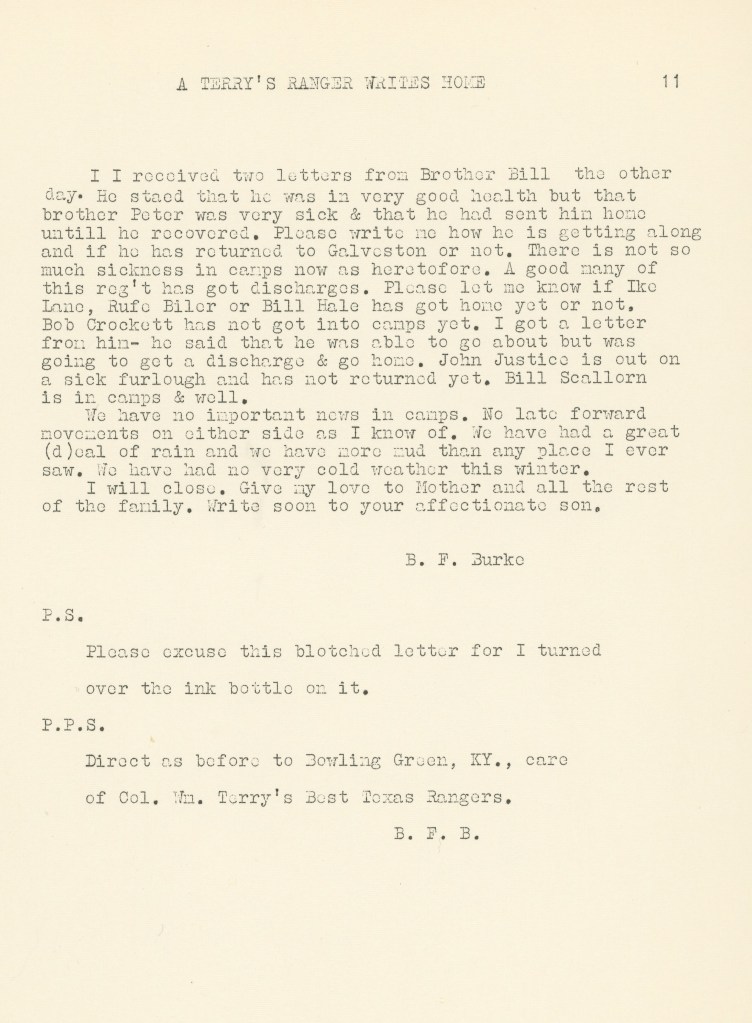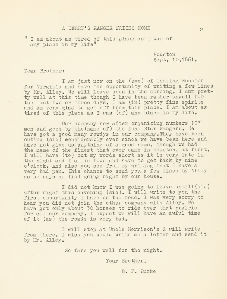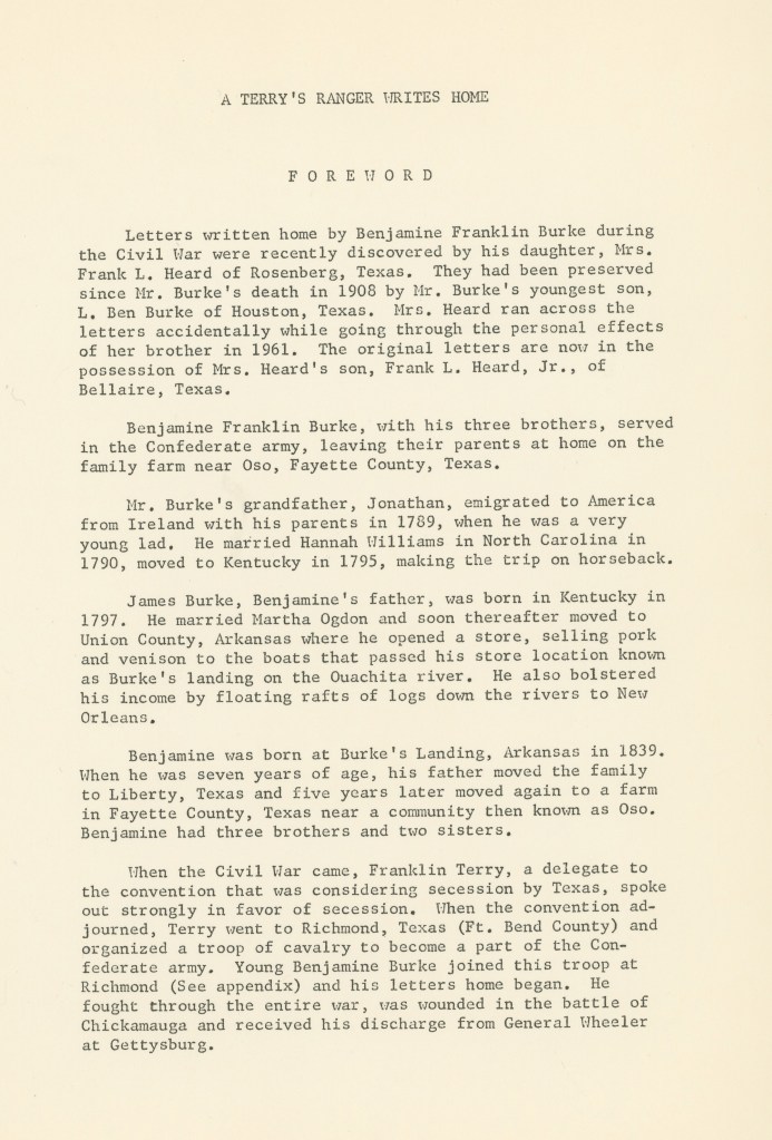 Benjamin F. Burke’s Letters in Terry’s Texas Rangers